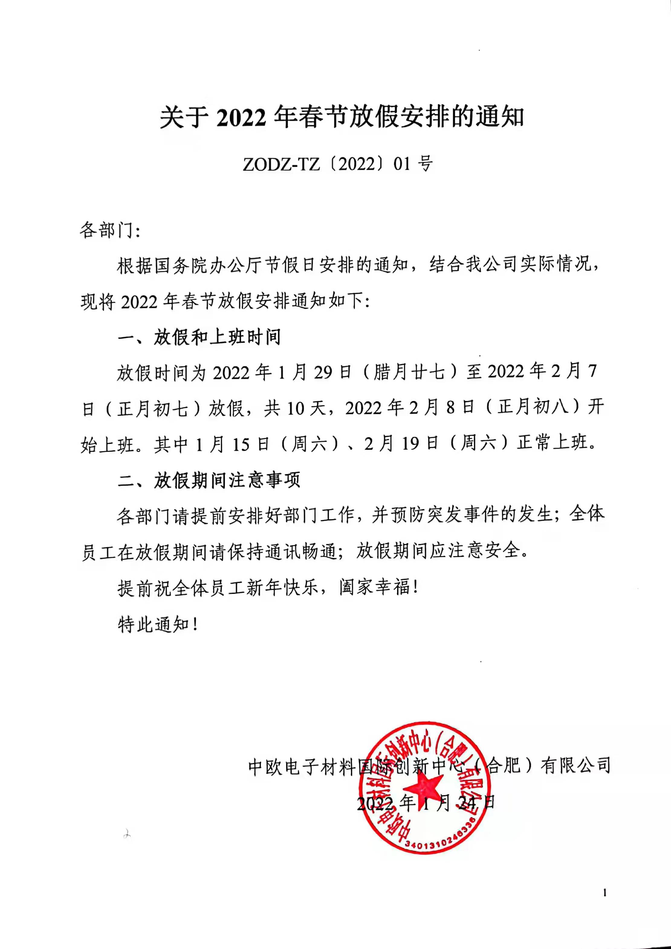 关于2022年春节放假安排的通知