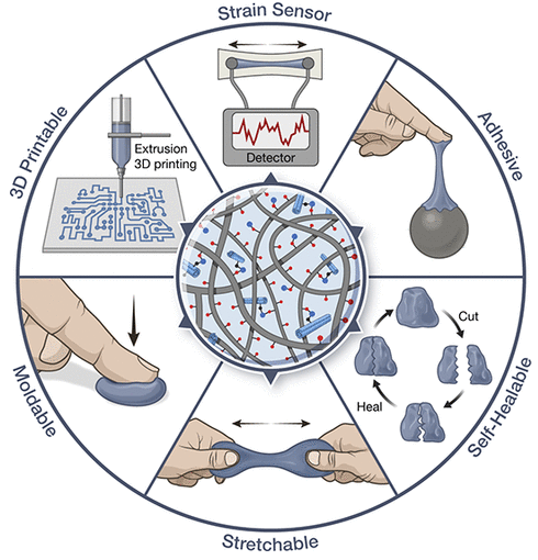 柔性电子材料由于可以适应人体的弯曲结构,有望用于实现智能医疗监控,甚至改变人机交互的方式。目前,柔性电子材料已用于很多智能系统,包括电子皮肤、软机器人和可穿戴设备。然而,当前制造出能够满足各种高级应用中复杂要求的材料仍然是一个挑战,包括导电性、粘附性、自我修复、柔性、可印刷和良好机械性能等等。