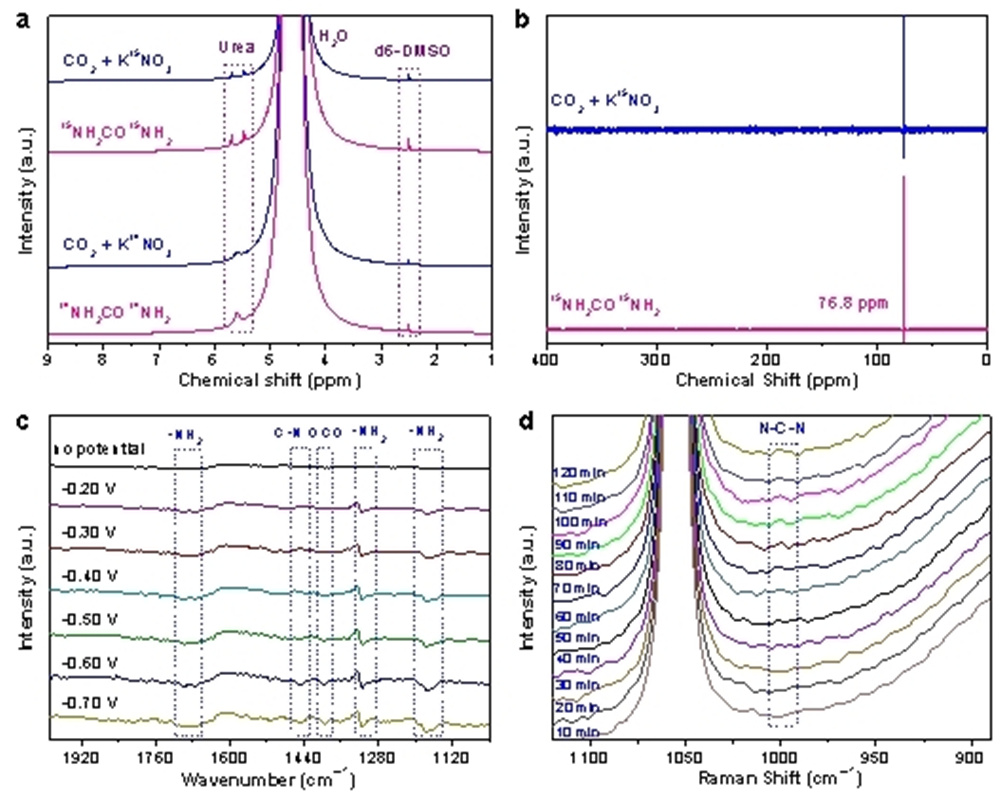 图1. (a) PdCu/CBC在−0.50 V (vs. RHE)最优电位下,使用K14NO3/K15NO3做电解液和标准物 (14NH2)2CO/(15NH2)2CO的1H NMR对比谱图; (b) PdCu/CBC在−0.50 V (vs. RHE)最优电位下,使用K15NO3做电解液和标准物 (15NH2)2CO的15N NMR对比谱图;(c) PdCu/CBC催化不同电位对应的原位同步辐射-红外光谱图;(d) PdCu/CBC在−0.50 V (vs. RHE)最优电位下不同反应时间对应的原位拉曼光谱图。