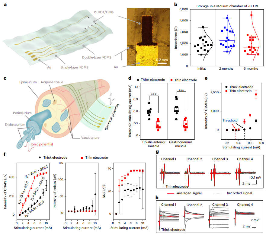 为了展示超薄PDMS-Au电极在植入式电子设备中的应用潜力,通过涂覆聚(3,4-乙基二氧噻吩)(PEDOT)/碳纳米管涂层,将该材料制成了型微米厚的神经电极,作为神经调制/信号记录的高质量接口。超薄PDMS-Au电极具有超低的阻抗,在真空室保存6个月(0.1 Pa),室温盐水浸泡973小时后保持稳定。由于的超薄PDMS-Au电极形变能力,超薄电极和神经组织之间形成了无缝界面,不使用粘合剂或缝线,因此对神经的损伤更少。相比之下,在厚电极与神经组织之间的界面上有明显的间隙。超薄电极与组织之间的无缝界面参与了有效的刺激传递和信号记录,特别是对于超小(~微伏)和噪声大的神经信号。为了刺激肌肉,超薄电极的平均阈值刺激电流(0.32 mA)明显低于厚电极(0.56 mA)。