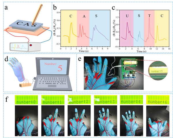 图2. (a) 压力传感器的原理图;(b, c) 在压力传感器上写 "CAS "和 "USTC "时的电阻变化;(d) 人机交互系统的示意图;(e) 戴着人机交互手套的志愿者打开他的手指,LED屏幕显示数字 "5";(f) LM水凝胶制备的人机交互手套根据志愿者手指的弯曲情况显示数字。