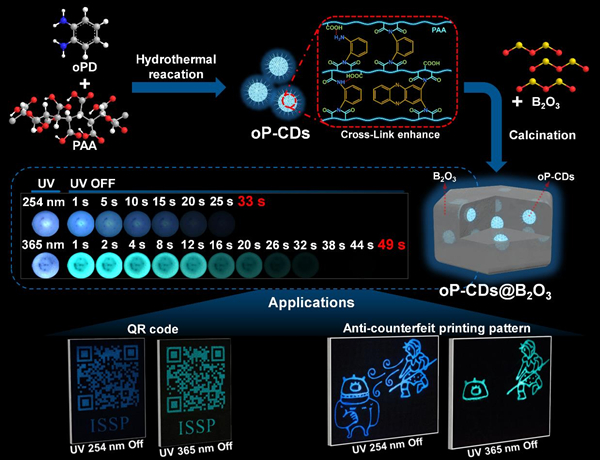 固体所研究团队设计了一种基于邻苯二胺(oPD)和聚丙烯酸(PAA)水热法合成的碳化聚合物纳米点,并通过热处理的方法将碳点嵌入刚性固定基质氧化硼(B2O3)中,获得了具有蓝色到绿色发光的超长RTP碳点复合材料(oP-CDs@ B2O3)。邻苯二胺的引入通过掺杂氮原子为碳点提供了多色发光中心,而聚丙烯酸作为长链聚合物,使得碳点具有碳化聚合物纳米点的性质,其长链结构通过共价键等有效的固定了碳点内部的发光色团,从而减少三重态激子的非辐射损耗,这种聚合物交联增强了碳点的磷光发射。同时,外部的刚性基质氧化硼通过自身的刚性和与碳点之间的共价键和氢键等作用力,进一步减少了碳点的非辐射损耗。聚合物结构和刚性基质的共同作用使得oP-CDs@ B2O3具有了长磷光寿命和高量子产率。oP-CDs@ B2O3肉眼可见的磷光余辉时长最长达到了49 s,磷光量子产率最高达到了19.5%,并且具有出色的抗光漂白性,在信息加密和防伪方面具有重要潜在应用。