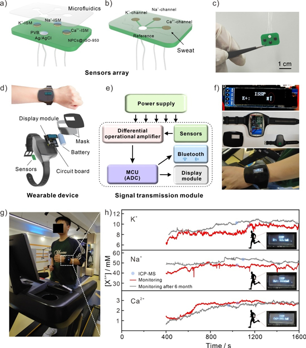 图. 监测汗液中电解质离子的全集成多路腕表:(a-c)三通道传感器阵列示意图和相应的光学照片;(d)全集成多路腕表的爆炸图;(e)包括电源管理、信号转导、处理、有线/无线传输到用户界面的传感器阵列传输组件的系统示意图;(f)志愿者佩戴的腕表以及相应内部的光学照片;(h)佩戴腕表的志愿者实时运动测试时的K+、Na+、Ca2+分析结果(红线)、半年后的监测结果(灰线)、相应的ICP-MS测试结果(圈)和显示实时监测模块照片(插图)。