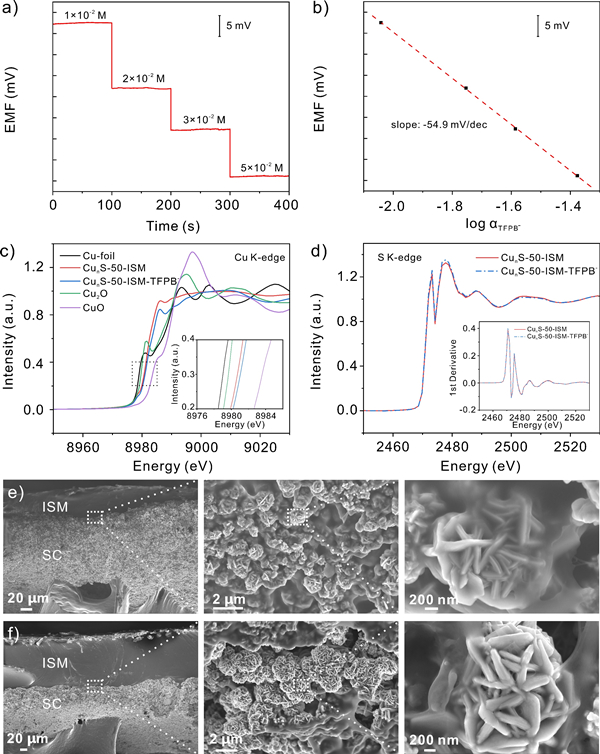 图2. CunS-50参与电位响应的机理探究:(a-b) CunS-50/Ca2+-ISE对TFPB-在o-NPOE溶液中的电位响应和校准曲线; (c) 归一化Cu K边XANES光谱; (d) 归一化S K边XANES光谱; (e, f) 长期电位稳定性测试前后ISM/CunS-50界面的截面电镜图。