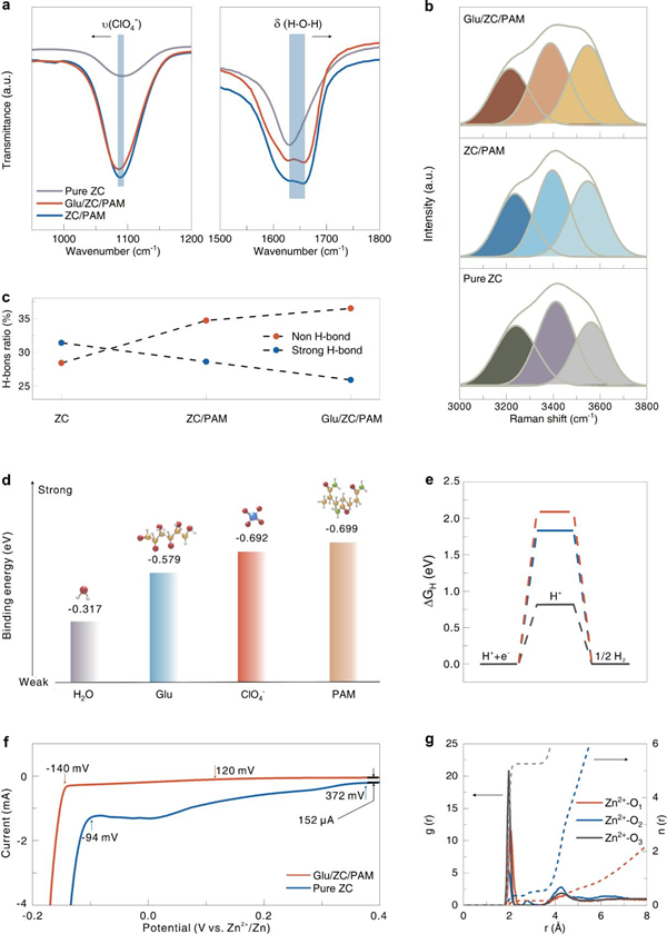 图2. a) 各种电解质的傅立叶变换红外光谱;b) 电解质在O-H伸缩振动区域的拟合拉曼光谱;c) 电解质中强H键和非H键的比例;d) 不同分子与水分子的结合能;e) 裸Zn、葡萄糖/Zn和聚丙烯酰胺/Zn吸附H+的吉布斯自由能(ΔGH);f) 通过分子动力学模拟得出Zn2+-O1 (Glu), Zn2+-O2 (ClO4-) and Zn2+-O3 (H2O)的径向分布函数。