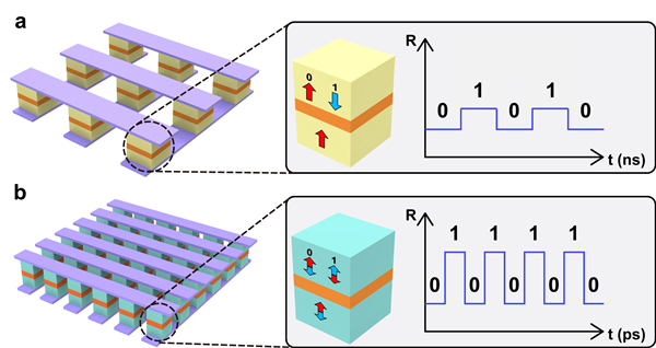 图1. 铁磁隧道结(a)和反铁磁隧道结(b)。