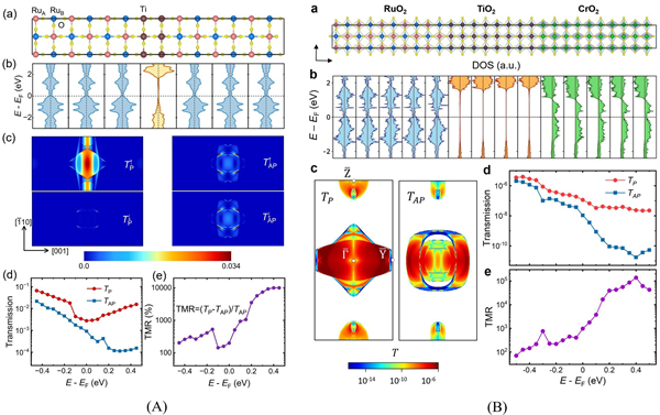 图2. (A) RuO2/TiO2/RuO2 (110) 反铁磁隧道结; (B) RuO2/TiO2/CrO2 (110) 磁性隧道结。