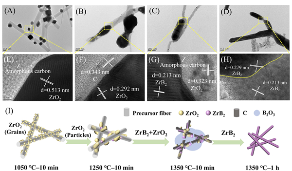 图2. 预氧化ZrB2陶瓷前驱体纤维在不同温度下煅烧后的TEM图:(A) 1050 ℃、10 min,(B) 1250 ℃、10 min, (C) 1350 ℃、10 min,(D)1350 ℃、1 h;(E-H)相对应的HRTEM图;(I) ZrB2晶须生长机理示意图。