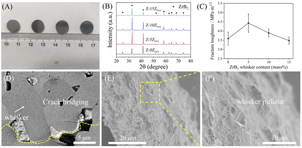 图3. 具有不同ZrB2晶须含量的ZrB2晶须/ZrB2陶瓷块的光学图像(A),XRD图谱(B),断裂韧性(C);(D) ZrB2晶须含量为5 wt%的陶瓷块抛光表面维氏压痕引起裂纹桥接的SEM图像;(E-F) ZrB2晶须含量为5 wt%的陶瓷块断裂面SEM图像(E),放大SEM图像(F)。