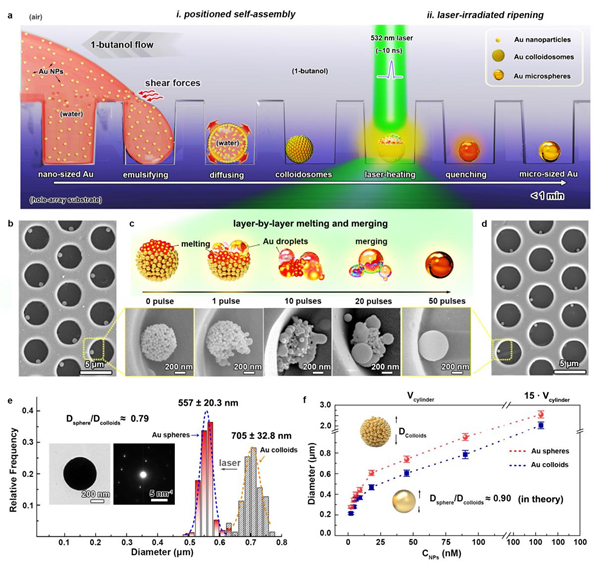 图1. “先组装后合成”的纯金微球阵列制备策略。(a)基于瞬态乳液自组装和激光辐照熟化策略制备纯金微球阵列的示意图;(b)通过定位瞬时乳液自组装获得的金超粒子阵列的典型SEM图;(c)激光辐照下单个金超粒子逐层熔融与融合成金微球的演化过程;(d)激光辐照熟化后纯金微球阵列对应的SEM图;(e)金微球和金超粒子的直径统计,插图显示了金微球的典型TEM图和SAED图;(f)调整金纳米球水溶液的浓度和微孔的体积实现金超粒子和金微球直径的控制。