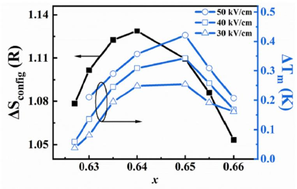 图1. BaxSryCaz(Bi0.5Li0.5)1-x-yO3系列陶瓷中构型无序熵及电卡绝热温变随组分的变化。