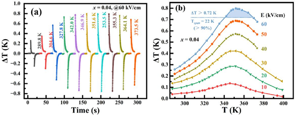 图2. BaTi1-x-ySnxZryO3陶瓷在x=0.04时的绝热温变随温度和外加电场的变化。