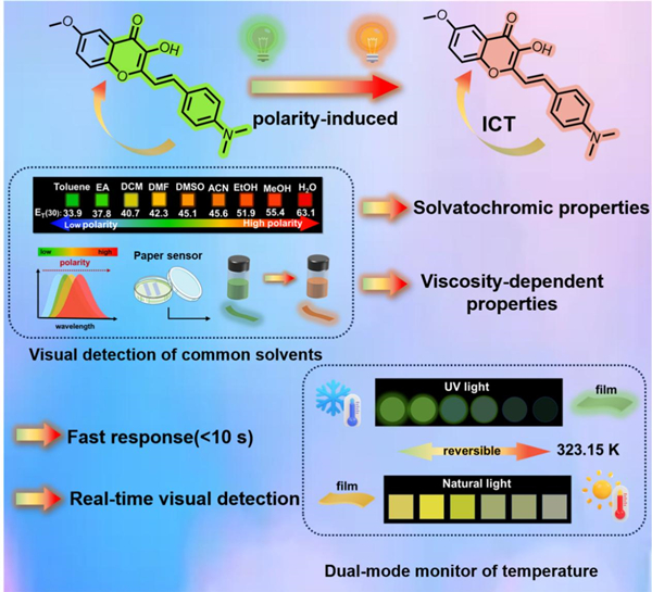 近日,中国科学院合肥物质科学研究院固体物理研究所蒋长龙研究员团队在可视化检测环境中多组分有机溶剂研究方面取得了新进展。该团队开发了一种具有光物理化特性的新型供体-受体(Donor-acceptor)类型的黄酮类荧光染料,其荧光颜色和强度会随极性和粘度的变化而改变,实现溶剂极性及温度的可视化快速响应。相关研究成果以“Donor-acceptor Type Solvatochromic Flavonoid Materials Fluorophores for Polarity Sensing and Real-time Temperature Monitoring”为题发表在Advanced Functional Materials (Adv. Funct. Mater., 2024, DOI: 10.1002/adfm.202415250)上。 供受体荧光染料(D-A)对特定分子或环境具有高选择性和敏感性,是理想的传感材料,广泛应用于环境监测、生物传感等方面,在传感器领域中有着重要的地位。然而,目前的供受体荧光染料由于在一定条件下量子产率较差,实际应用中经常出现荧光猝灭现象,同时还面临着性能稳定性、光照条件下的表现等方面的挑战。因此,亟需综合考虑材料设计、合成方法以及实际应用中的环境因素等,开发新的D-A染料并进行功能化复合研究,进而优化其性能、拓展其应用。