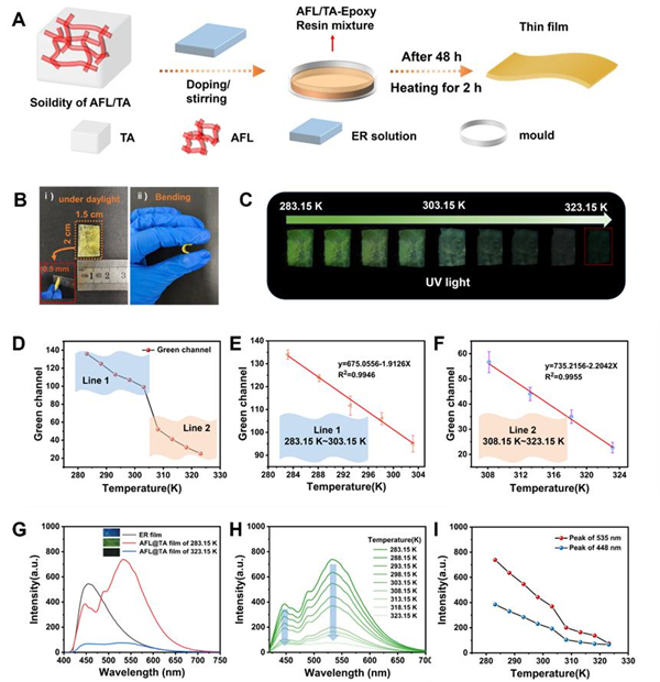 在此基础之上,研究人员通过将AFL染料与十四烷酸(tetradecanoic acid,TA)复合设计出AFL@TA复合传感材料,其粘度随温度变化而改变,进而诱导荧光强度变化。在高粘度条件下,AFL@TA荧光强度增强,而低粘度则会导致荧光强度减弱,实现对温度的可视化监测。为进一步拓展AFL@TA复合传感材料的应用,研究人员制备了厚度为 0.05 cm 的AFL@TA复合膜,它具有良好的柔韧性、可回收性与稳定性,可在各种场景甚至一些极端条件下用作温度传感器。在 283.15-323.15 K 的温度范围内,温度与荧光强度之间存在良好的线性关系,复合薄膜的绿色荧光随着温度的升高而减弱。传感器的荧光模式和比色模式都可以实现对温度的实时视觉检测,且响应速度极快。