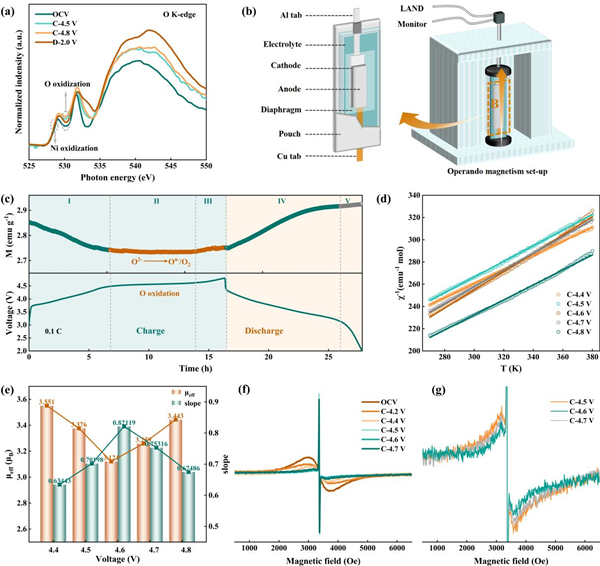 图1. 富锂锰基正极材料:(a) PFY模式下不同充/放电态的sXAS光谱;(b)电池原位磁性测试装置示意图;(c) 0.1C下初始充/放电曲线及相应的磁化强度曲线;(d)磁化率倒数的温度依赖关系曲线;(e)χ−1-T曲线的斜率及有效磁矩计算结果;(f)非原位EPR光谱及其(g)部分局部放大图。