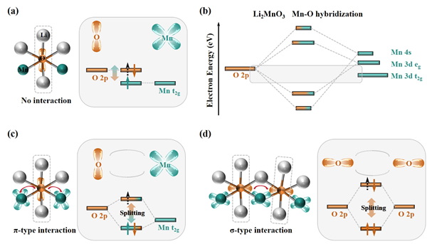 图3. 富锂锰基正极材料中氧氧化时的轨道和相互作用示意图:(a)无相互作用;(b)Mn t2g和O 2p杂化轨道示意图;(c)π型相互作用;(d)σ型相互作用。黑色箭头表示充电过程中从O 2p轨道中提取的电子。