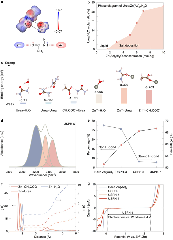图2. (a) Zn(Ac)₂和尿素的静电势(ESP)分布,以及Zn²⁺-尿素-Ac⁻间相互作用的示意图;(b) 尿素/Zn(Ac)₂/H₂O的相图;(c) 电解质中不同物种间的结合能;(d) USPH-5电解质在O-H伸缩区域拟合后的傅里叶变换红外光谱(FTIR);(e) 电解质中强氢键和非氢键的比例;(f) 从USPH-5电解质的分子动力学模拟(MD)中收集的Zn²⁺-Ac⁻、Zn²⁺-尿素和Zn²⁺-H₂O的径向分布函数(RDF);(g) 各种电解质的电化学窗口。