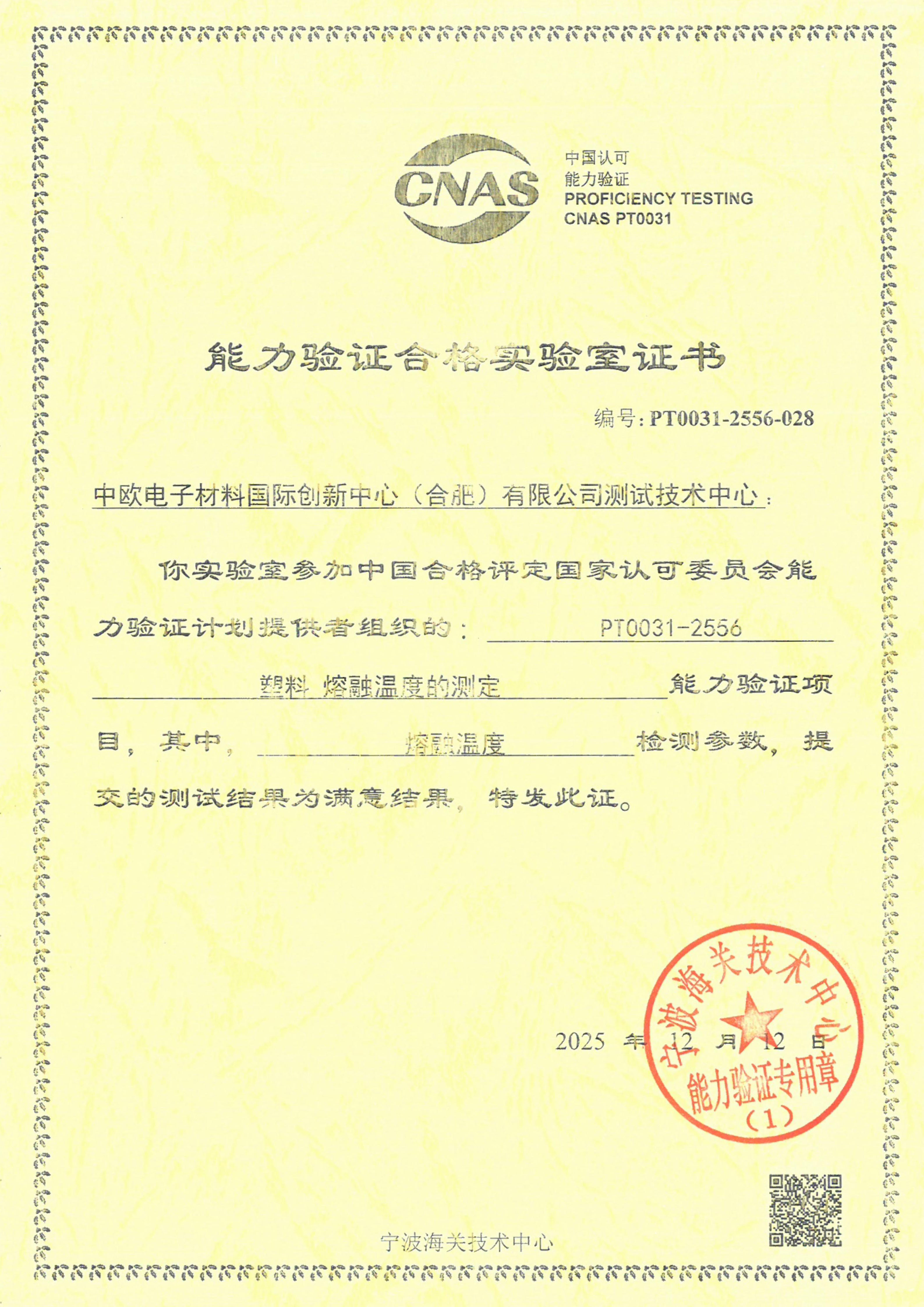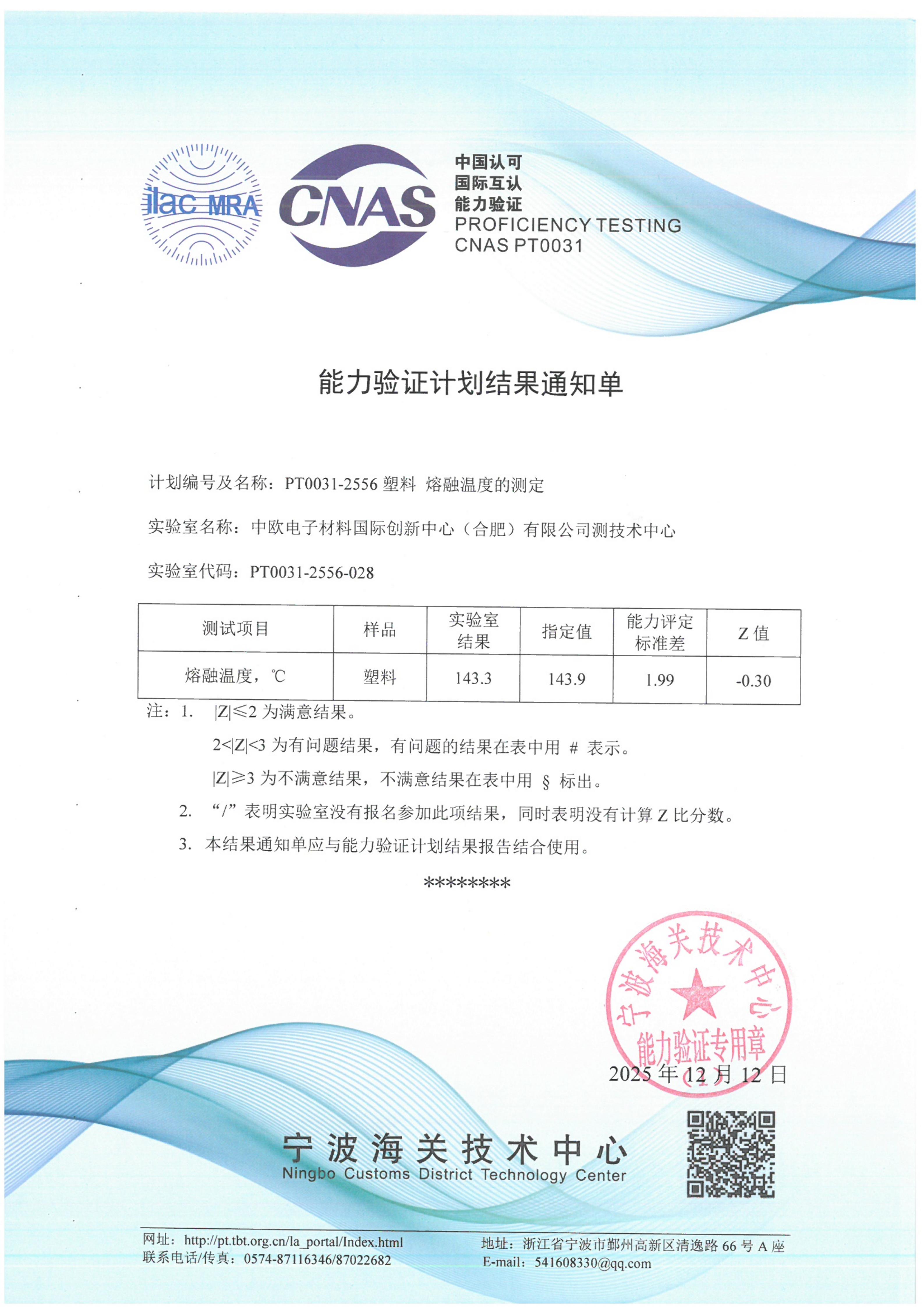 近日,WG官网WG官网实验室参加了CNAS PT 0031-2556 能力验证,顺利通过塑料熔融温度的测定,取得满意结果(z值为-0.30),通过能力验证,并获得CNAS能力验证合格实验室证书。